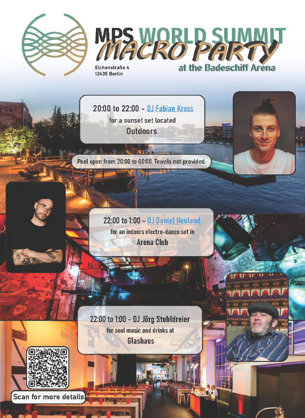 Two different visual styles were used to represent showtimes and events: the 2023 Macroparty flyer was designed to present individual DJs and the ambiance of their locations in a larger complex; the 2024 Macroparty flyer utilized an unconventional timeline to convey showtimes while maintaining classic 70s-80s flyer motifs popular along the West coast of the United States.